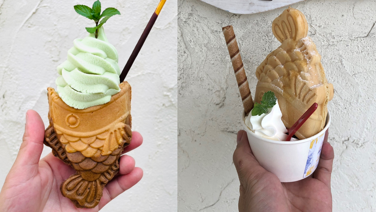 ニューヨークタイヤキの特徴は生地はサクサクで中はもちもちのたい焼きでソフトクリームとの合性は抜群です